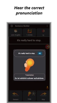 The app has two games that aim to improve your language skills. Both games focus on sentences, which helps you practice sentence structure as you read, listen or pronounce the tasks. Your sentence building and comprehension skills will improve.